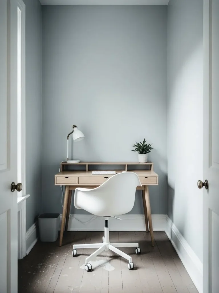 I honestly think this design is such a win for anyone working with a narrow or awkward space. Pale grey has this magical way of making walls feel like they step back instead of closing in. I can totally imagine sitting here with a coffee and actually enjoying getting work done. It feels peaceful but not boring and that balance is hard to get right. If small rooms had a favorite paint color this would definitely be on their list.