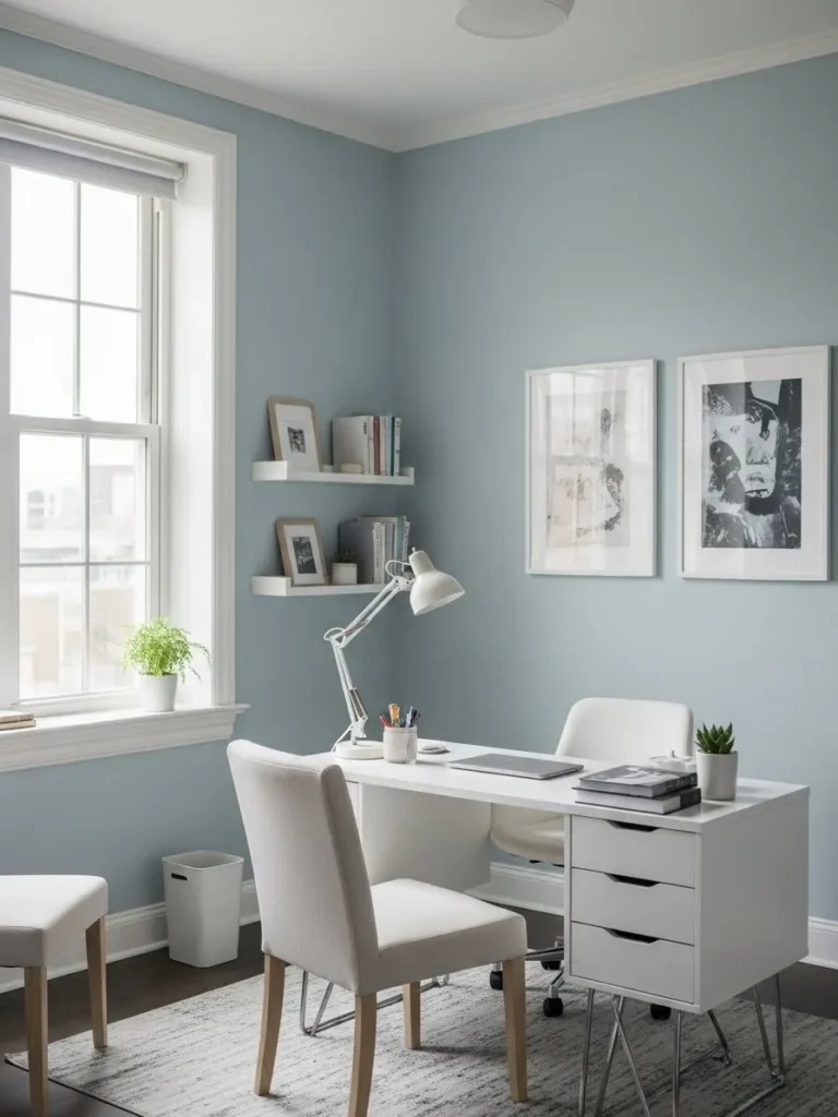 This light and airy home office uses a soft blue paint color that instantly opens up the space and makes it feel calm and breathable. The walls reflect natural light beautifully, especially next to the large window with crisp white trim. Clean white furniture keeps everything feeling fresh and uncluttered, while the simple desk and slim storage drawers make the room feel bigger than it actually is. Floating shelves add just enough personality without overwhelming the walls, and the light wood accents bring in a subtle warmth that balances the cool tones perfectly.