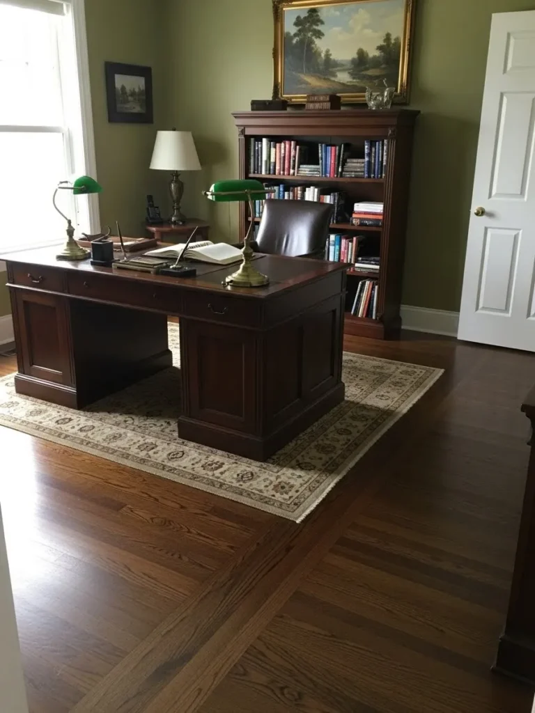 This home office pairs rich olive green walls with deep dark wood floors for a look that feels grounded and timeless. The paint color has a soft earthy depth that keeps the room from feeling heavy while still adding warmth and character. A traditional wood desk anchors the space and mirrors the tone of the floors which creates a really satisfying sense of balance. Built in bookshelves and vintage style lighting add charm without overwhelming the room and the light rug underneath helps soften all that beautiful wood.