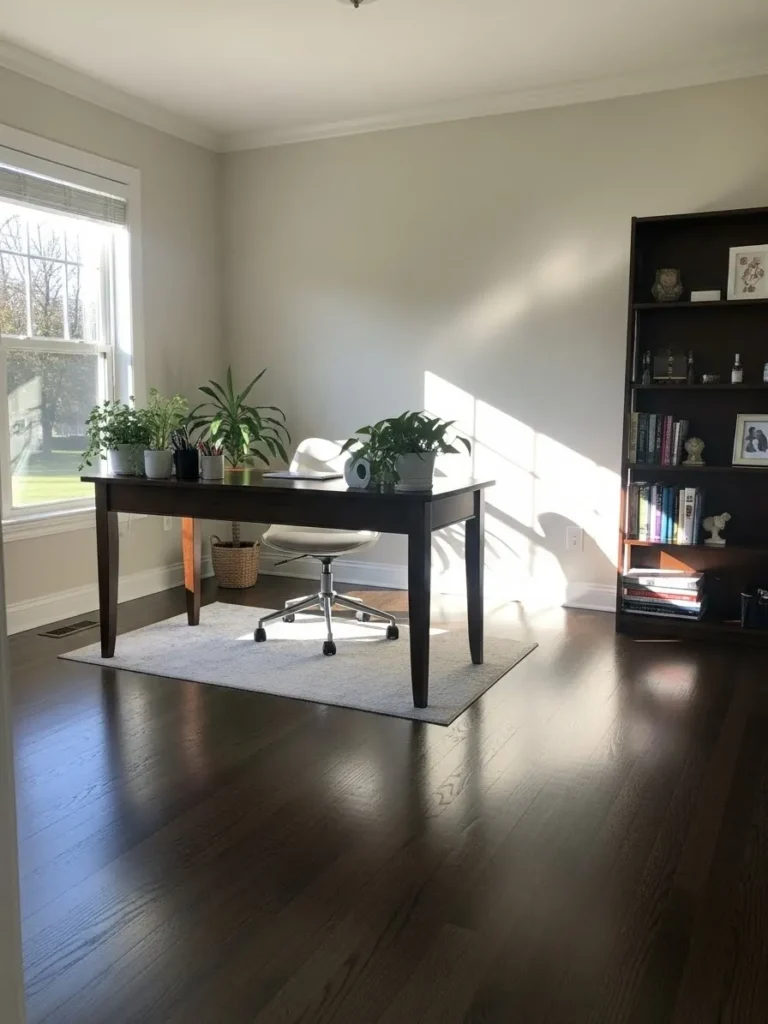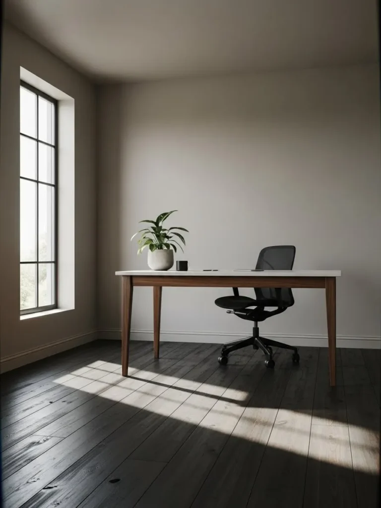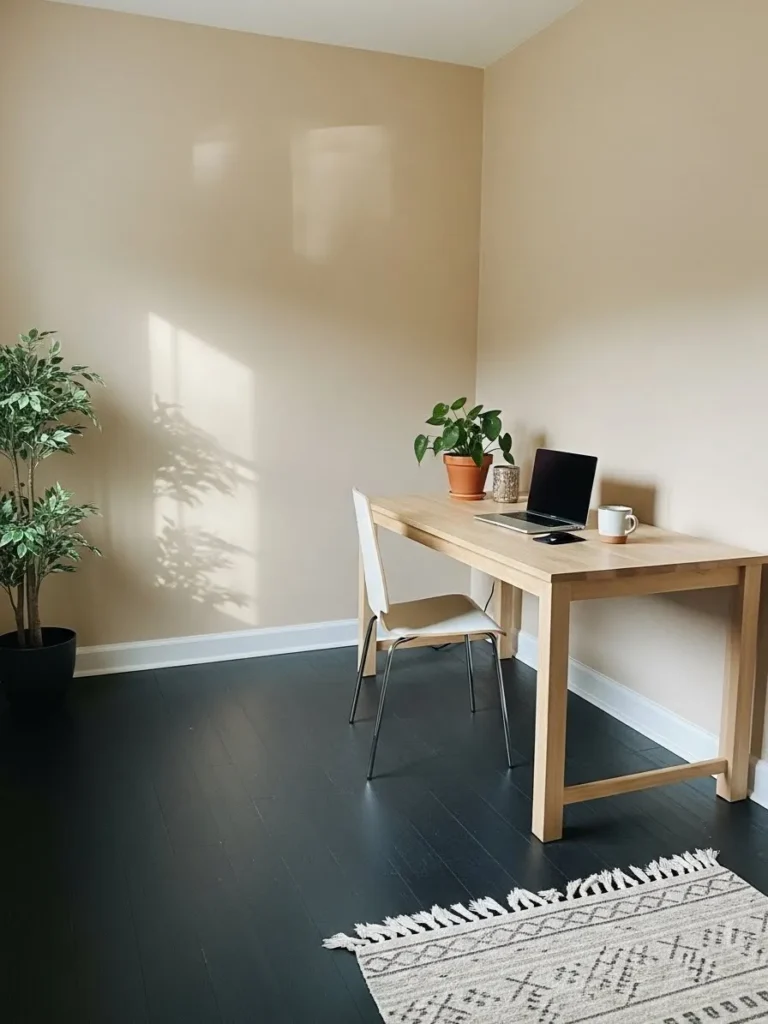 Warm Neutral Office With Sunlit Dark Floors