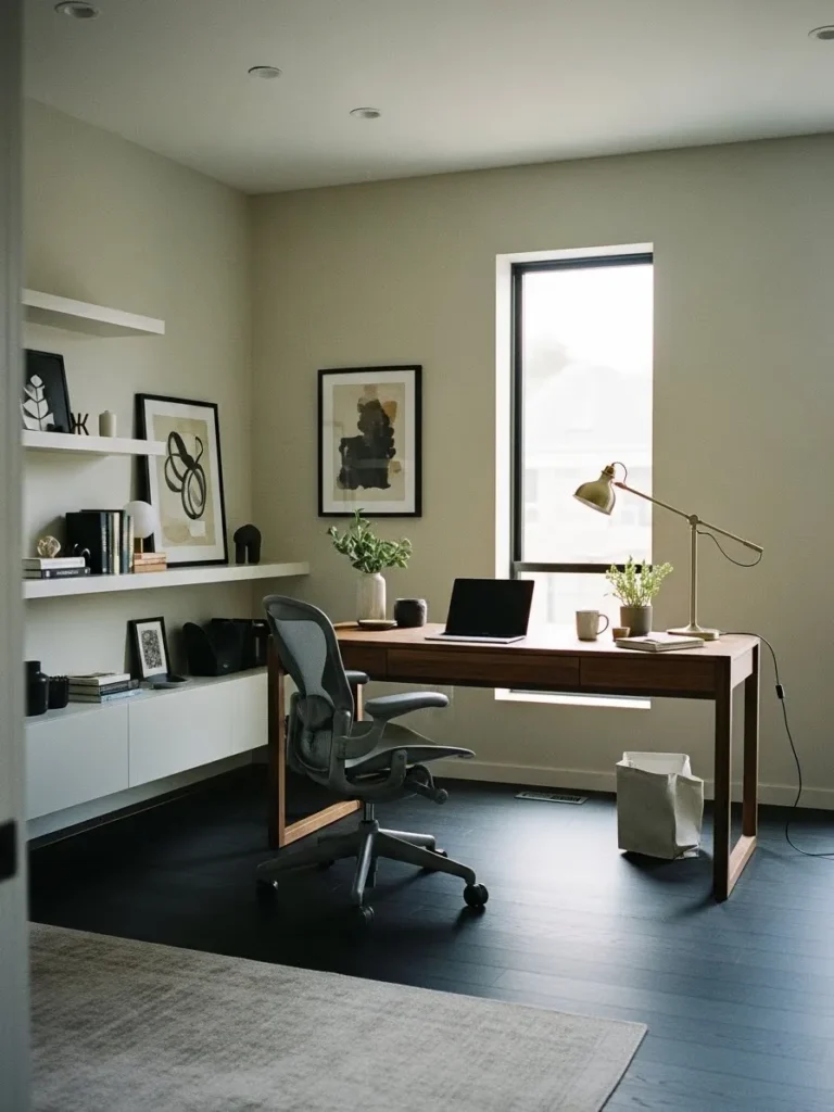 I love how this space feels put together but not fussy. It is the kind of office that makes you want to sit down with your coffee and actually enjoy your to do list. The balance between light walls and dark floors feels cozy and confident at the same time which is honestly my favorite combo. This design proves you do not need bold colors to make a statement when the tones are chosen just right.