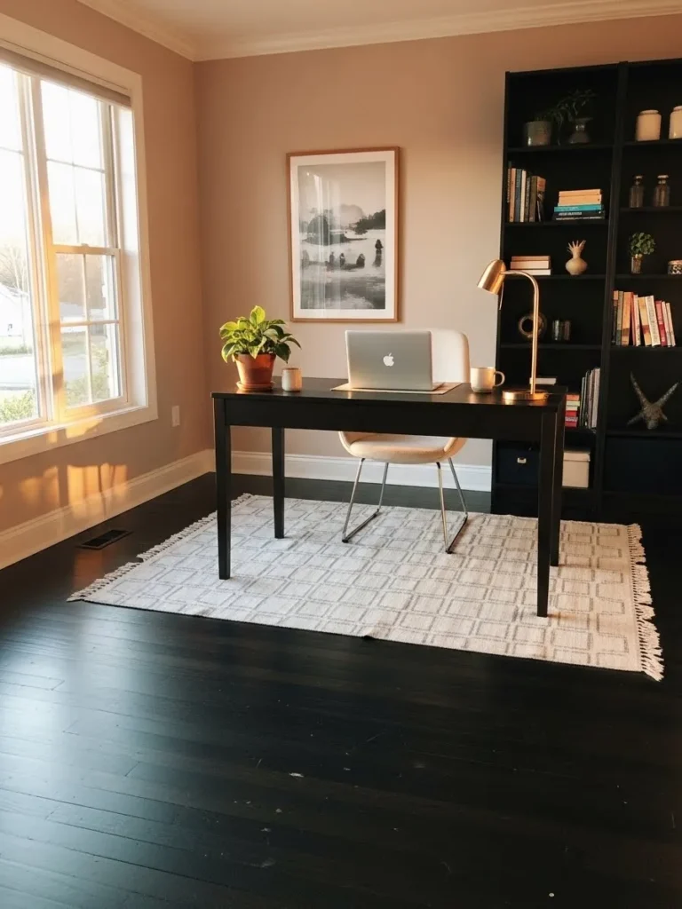 This office design pairs soft taupe walls with rich dark wood floors in a way that feels calm and grounded instead of heavy. The black desk and tall black bookcase add structure and contrast while still letting the room feel airy thanks to the warm wall color and natural light pouring in from the window. Light accents like the cream chair, textured rug, and simple framed art keep everything balanced so the dark floors feel intentional and cozy rather than overpowering.