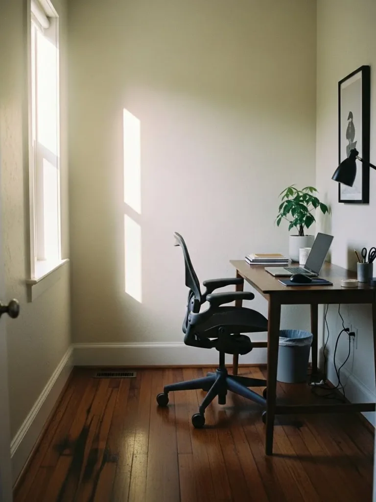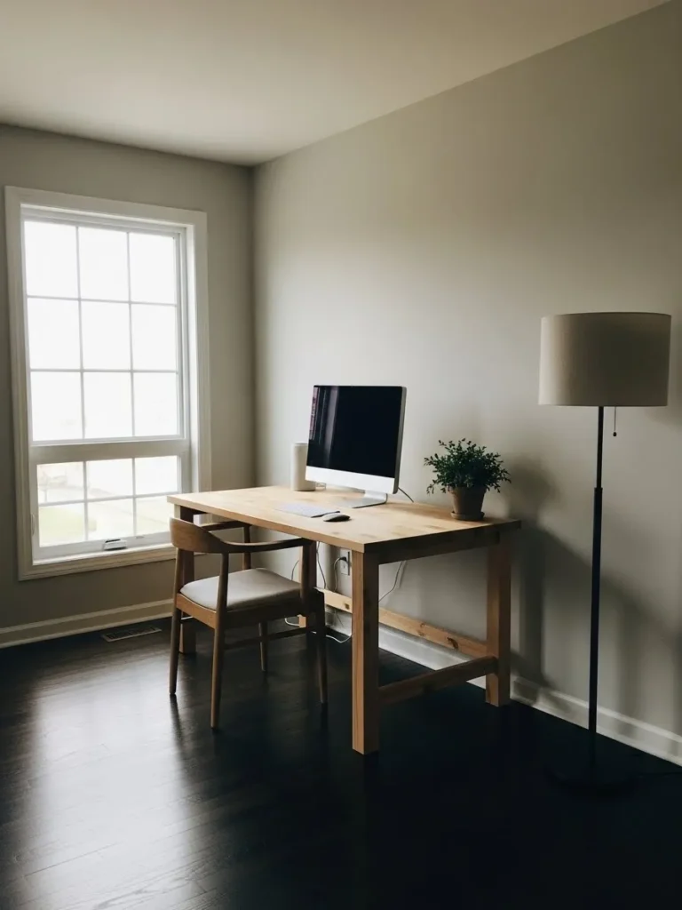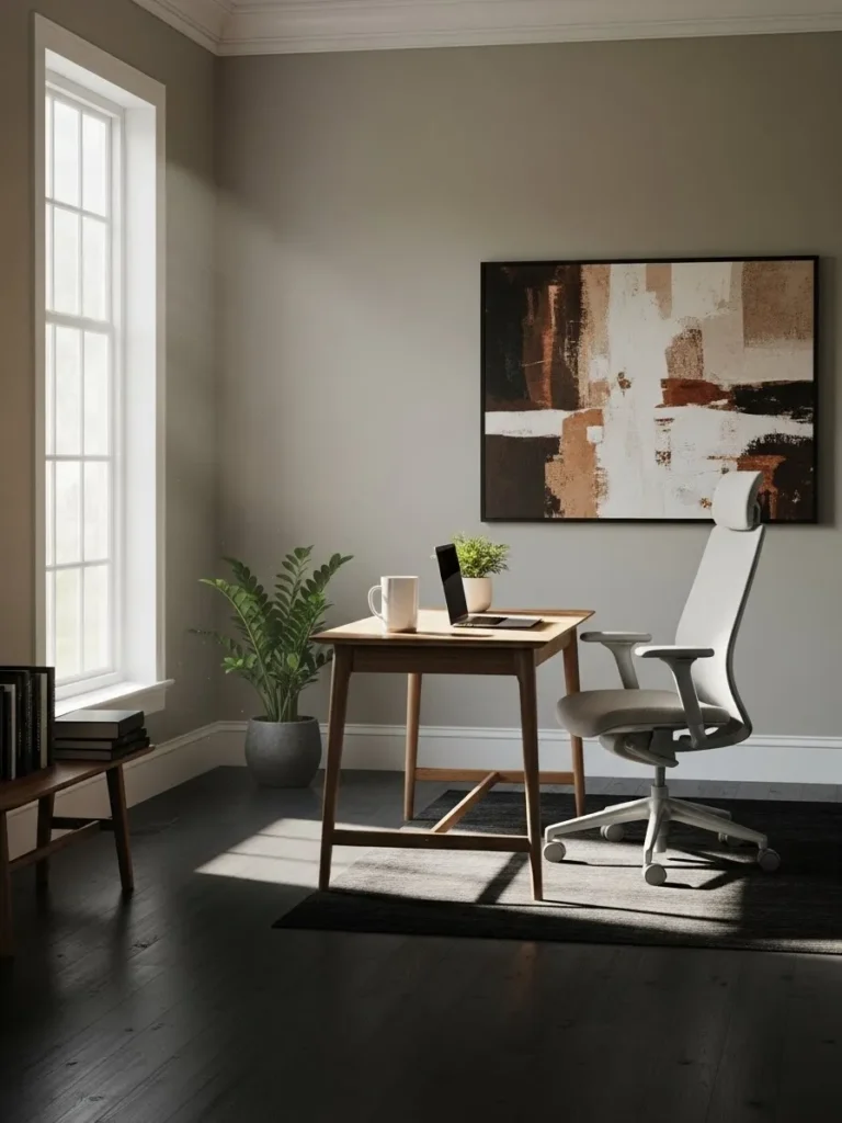 Soft Greige Walls With Sunlit Minimal Office Charm