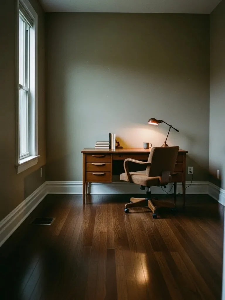This office feels calm and grounded thanks to the soft olive walls paired with rich dark wood floors that instantly add depth. The space keeps things simple but thoughtful, with a mid-century style wooden desk, a cozy upholstered chair, and just the right amount of styling to feel lived in without looking busy. Natural light from the window softens the wall color beautifully, while the warm desk lamp creates a gentle glow that makes the whole room feel inviting and focused at the same time. It is the kind of setup that feels intentional but never fussy, which is exactly what a balanced home office should be.