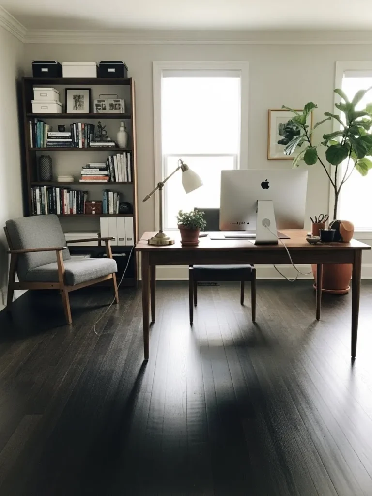 I honestly love how peaceful this room feels the second I look at it. The color combo makes me want to sit down, clear my head, and actually enjoy working for once. It proves that dark floors do not have to feel dramatic or moody if the wall color is just right. This kind of setup feels realistic for real life too, not overly styled but still Pinterest worthy in that effortless way that makes you want to copy it immediately.