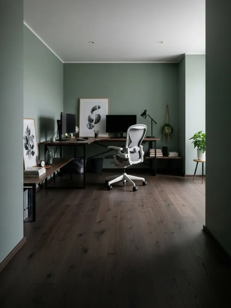 Muted Green Home Office With Warm Dark Floors