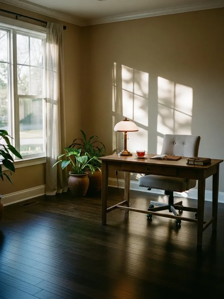 I really appreciate how relaxed this office feels without sacrificing style. The warm walls and dark floors create a cozy foundation that still looks polished, especially when the sunlight hits just right. If you love a workspace that feels peaceful but not plain, this setup totally delivers. It is the kind of room that makes sitting down to work feel less like a chore and more like a quiet moment you actually look forward to.