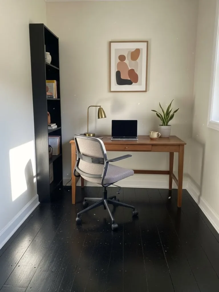 This home office keeps things calm and grounded with soft cream walls paired beautifully with deep dark wood floors. The contrast feels intentional but not harsh which is such a sweet spot for working spaces. A warm wood desk adds a cozy touch while the black bookcase brings a little structure and balance to the room. Natural light bouncing off the light walls keeps everything feeling open and fresh even with the darker flooring. Simple decor like the abstract art and leafy plant keeps the space from feeling busy while still giving it personality.