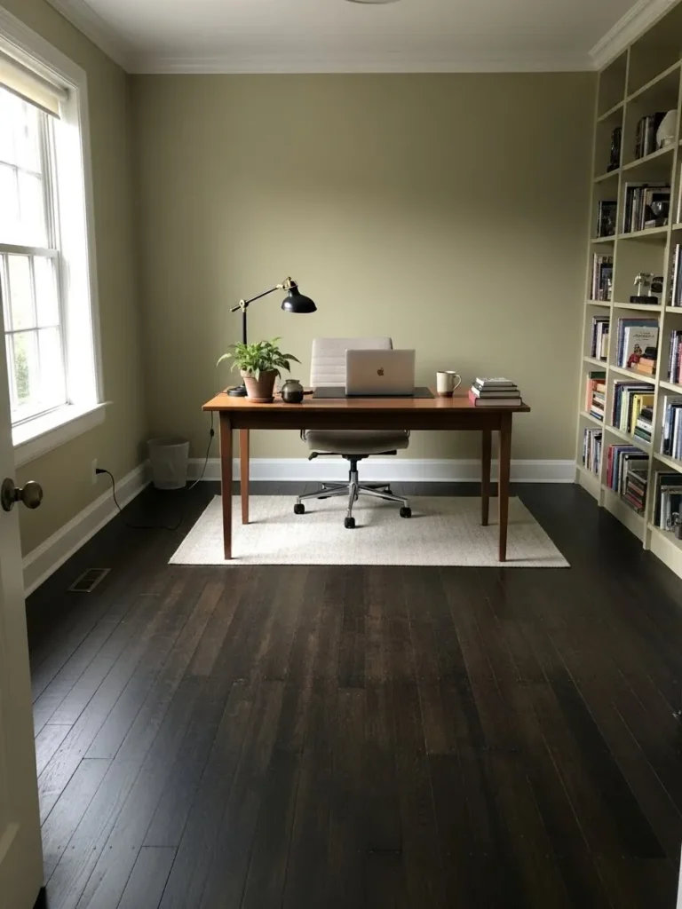 This office uses a muted green wall color to soften the look of deep dark wood floors, creating a space that feels relaxed and intentional. The walls have a gentle earthy tone that reflects natural light beautifully without feeling too bright. Clean white trim keeps the room crisp, while the wood desk and shelving echo the warmth of the floors. Simple styling with books, ceramics, and a leafy plant adds personality without cluttering the space.