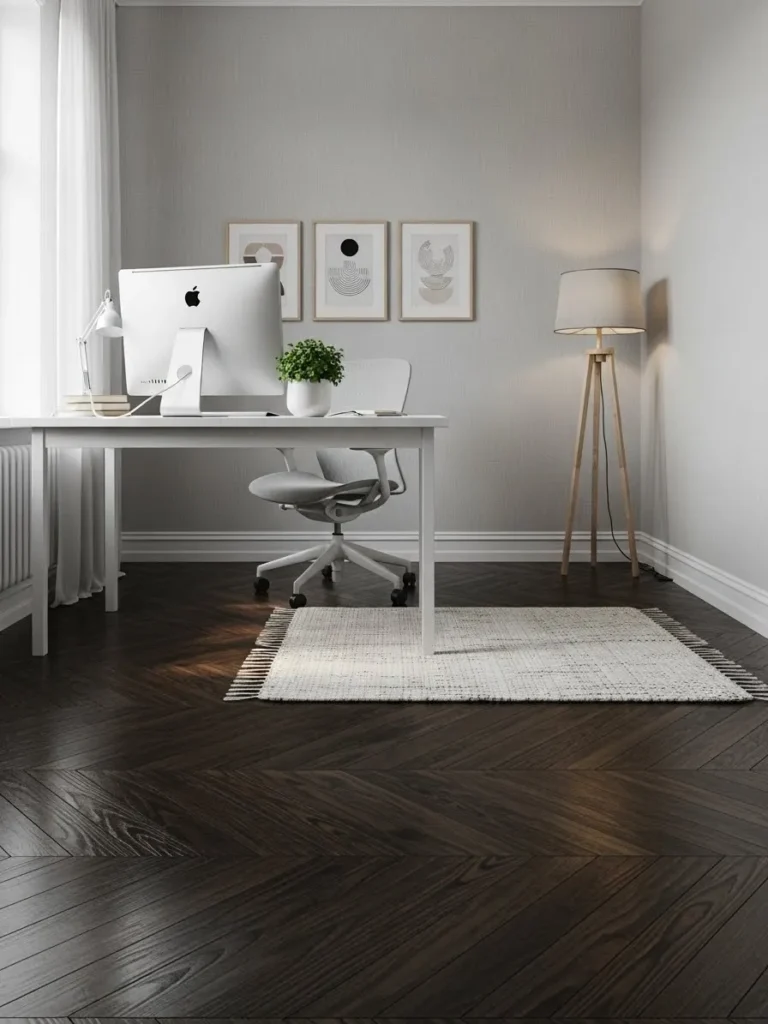 Soft Gray Office With Dark Herringbone Floors