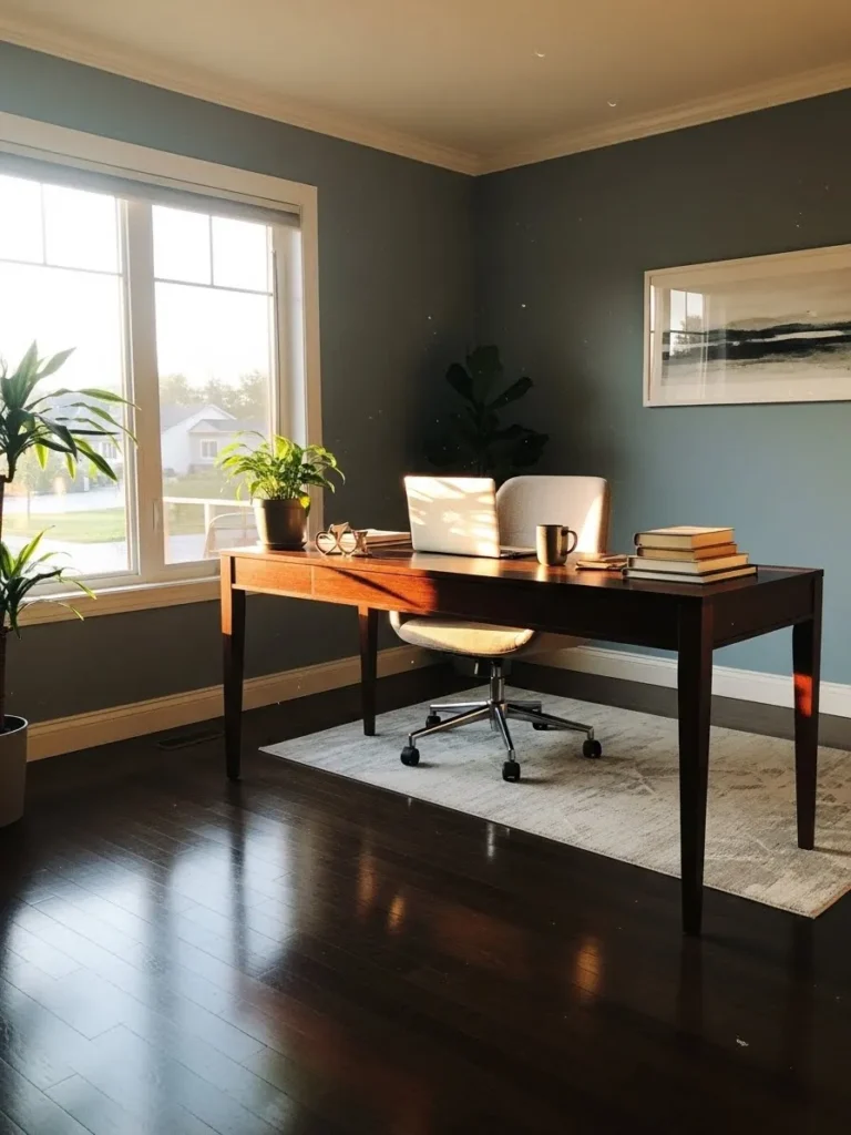 This home office pairs rich blue gray walls with glossy dark wood floors for a look that feels calm yet grounded. The deep wall color adds depth without making the space feel heavy especially with all that natural light pouring in through the large window. A warm wood desk softens the mood and brings balance while the simple upholstered chair keeps everything comfortable and unfussy. Clean white trim and crown molding frame the space nicely and give it that polished finished feel without trying too hard.