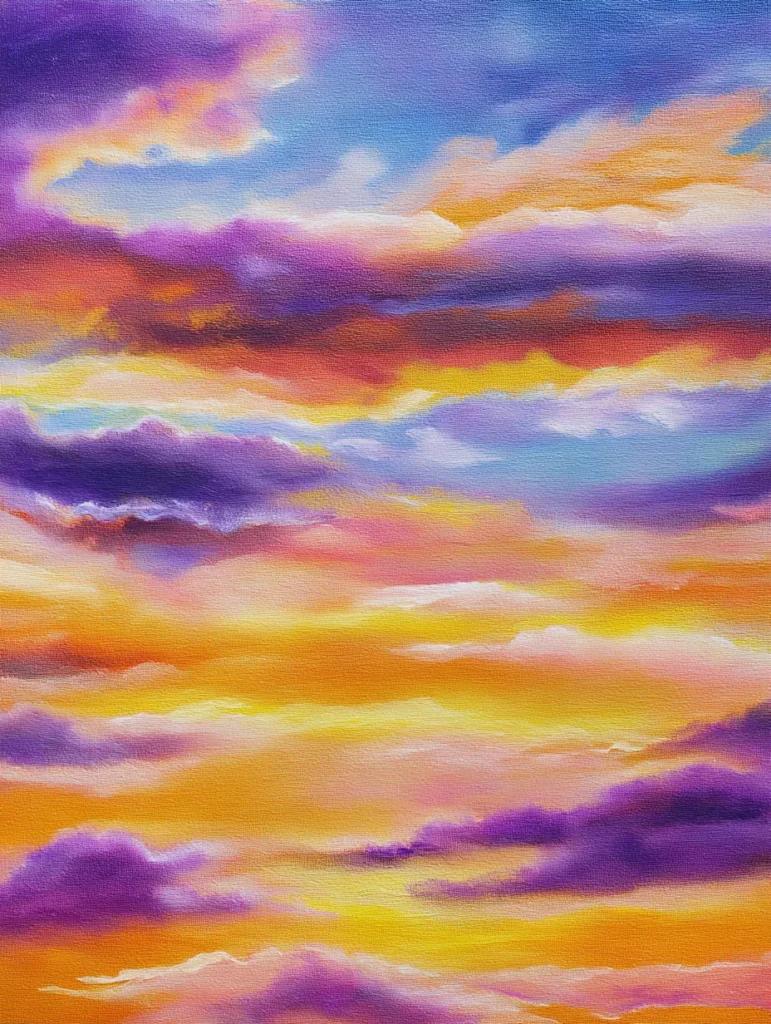This design captures the breathtaking movement of a twilight sky through a stunning array of purple, gold, and coral tones. The composition is entirely focused on horizontal layers of wispy clouds that stretch across the canvas in a rhythmic flow. Soft and blended brush strokes create a feathered effect where deep violet edges meet bright sunny yellow centers. The overall layout feels expansive and airy as the warm light seems to radiate from the middle of the frame and pushes the cooler lavender shadows toward the top and bottom.