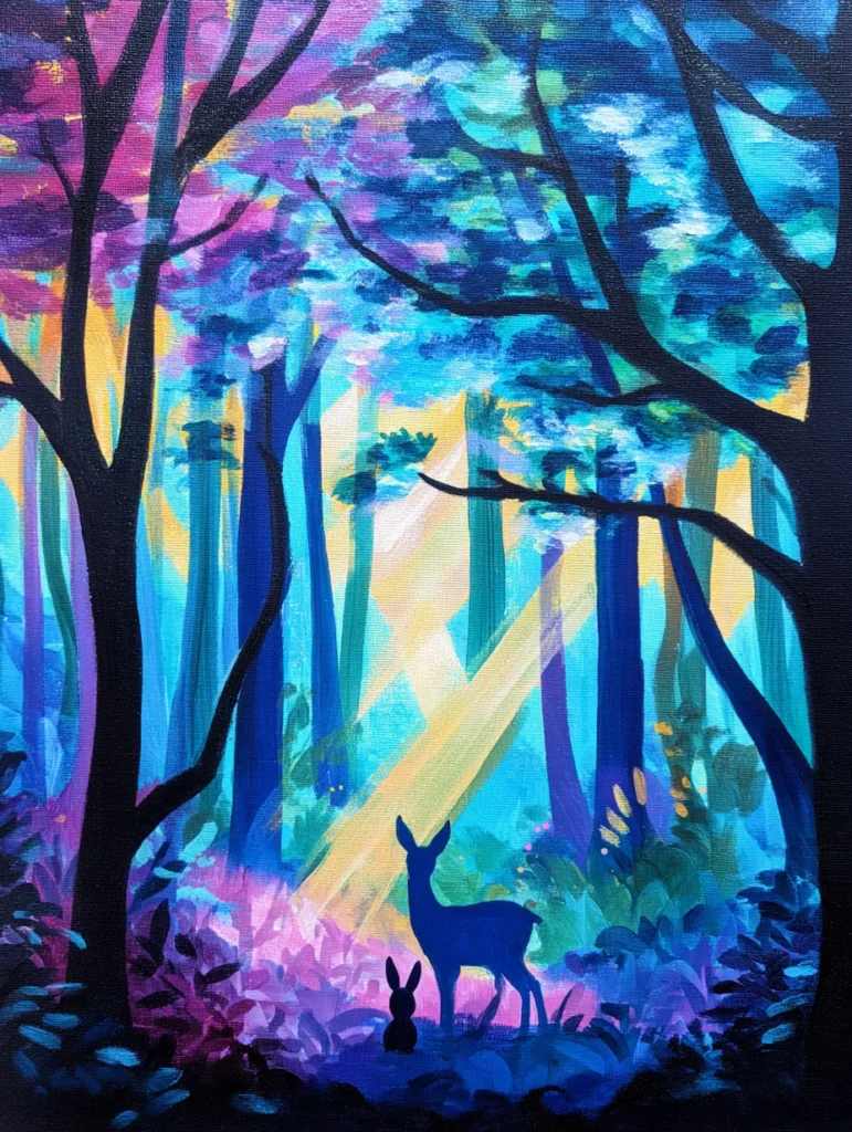 This enchanting scene features a silhouette of a graceful deer and a tiny rabbit nestled within a glowing, neon-infused forest. The composition is expertly framed by dark, spindly tree trunks in the foreground that lead your eye toward a brilliant shaft of golden light cutting through the center. A striking palette of electric blue, deep magenta, and turquoise brings the foliage to life, while soft, dabbing brush strokes create a lush, textured forest floor. The overall layout feels incredibly balanced and immersive, as the cool, shadowy tones of the outer edges contrast beautifully with the warm, radiant glow of the hidden clearing.