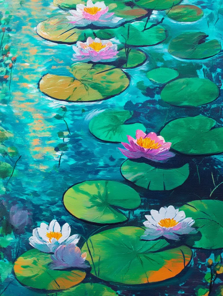 This gorgeous composition centers on a peaceful pond filled with floating green lily pads and delicate blooming water lilies. The color palette is a refreshing mix of emerald and teal for the water, while the flowers pop in soft shades of white and blush pink with sunny yellow centers. You can see thick, dappled brush strokes on the petals that give them a wonderful 3D effect, and the water features light reflecting off the surface in shimmering golden tones. The layout uses an angled perspective that leads your eye from the bottom corner up through the scattering of lily pads, creating a beautiful sense of depth and tranquility.