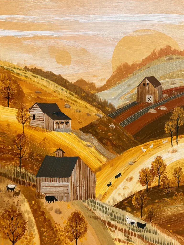 This charming landscape depicts a peaceful farming valley bathed in a monochromatic palette of honey, mustard, and chocolate brown. The composition features several rustic wooden barns with dark roofs nestled among sloping hills and tilled fields. Fine vertical brush strokes create the texture of weathered wood on the buildings and rows of crops in the distance, while soft horizontal strokes form the hazy sky and a large pale sun. Tiny silhouettes of farm animals are dotted along the winding paths, adding a delightful sense of life to the organized and grounded layout.