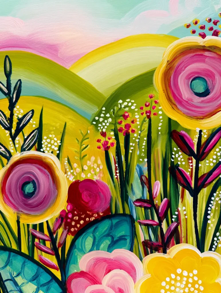 This design is a total celebration of color and texture, featuring oversized floral blooms in the foreground and soft rolling hills in the back. You can see thick painterly brushstrokes in shades of fuchsia and buttery yellow forming the flower petals, while the background hills transition from a zesty lime to a soft grassy green. The layout is packed with charming details like tiny white dots representing baby’s breath and whimsical teal leaves with scale-like patterns. It feels incredibly lush and full of life thanks to the layered composition that places you right in the middle of a magical meadow.
