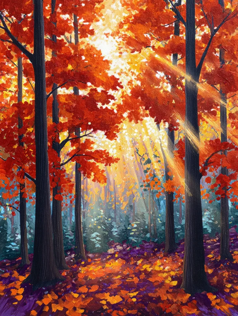 This stunning piece captures the essence of a crisp fall day using a fiery palette of burnt orange, deep crimson, and brilliant gold. The composition centers on a group of dark, slender tree trunks that frame a glowing light source in the background, making it look like the sun is peeking through the canopy. Short, dabbing brushstrokes create a thick texture for the fallen leaves on the ground, while streaking diagonal lines represent soft sunbeams filtering through the branches. The contrast between the cool purple shadows on the forest floor and the warm orange leaves above creates a balanced and inviting layout.