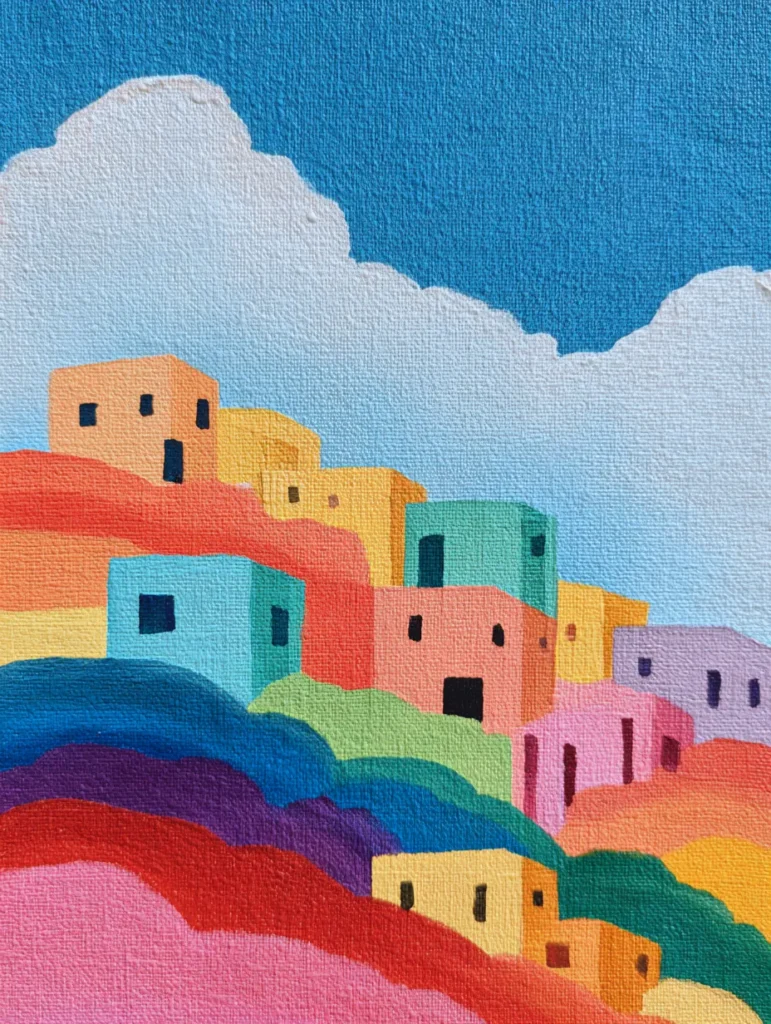 This delightful design features a cluster of blocky, cube-like houses nestled against a series of vibrant, multi-colored hills. The color palette is a dream, mixing soft lavender, dusty rose, and sandy yellow with pops of bright turquoise and deep forest green. Thick, visible canvas texture gives the flat areas of color a tactile quality, while the fluffy white clouds in the bright blue sky add a sense of height and fresh air. The composition is cleverly tiered, leading your eyes up the hillside through a playful arrangement of simple geometric shapes and tiny black windows that ground the whimsical scene.