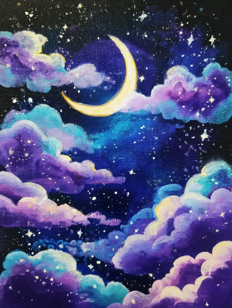 I am starstruck by how peaceful this night sky looks on canvas. It is such a rewarding project to try because you can practice your blending skills on those billowy clouds without needing perfectly straight lines. If you love the idea of creating your own little corner of the universe, this design is an amazing way to play with contrasting dark backgrounds and luminous highlights. It feels like a quiet, meditative escape that results in a piece of art that is totally out of this world.