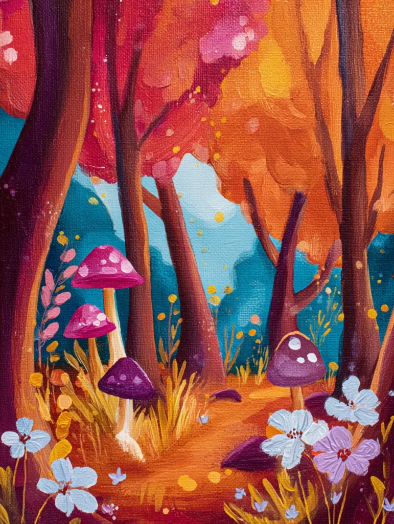 I think this piece is an absolute joy to recreate because it allows you to lean into your most playful instincts. You get to mix those bold sunset colors with cool earthy tones, and there is something so satisfying about painting those little white dots on the mushroom caps. It feels incredibly relaxing to build up the forest floor with different floral shapes, and I bet you will feel like a total storytelling pro once the whole magical scene comes together on your canvas.