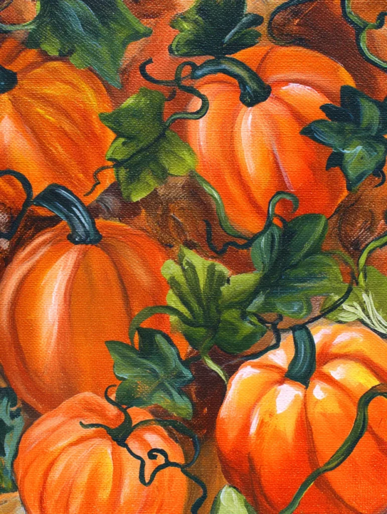 This cozy design fills the entire frame with plump, sun-ripened pumpkins in a variety of vibrant orange and apricot tones. The composition is wonderfully crowded, showcasing large gourds nestled together with twisting green vines and deep emerald leaves that weave through the gaps. You can see smooth, blended brushstrokes that give each pumpkin a rounded, 3D effect, while thinner lines are used to create the delicate, curly tendrils. The layout feels very organic and grounded, using rich brown shadows in the background to make the bright, warm colors of the harvest really pop off the canvas.