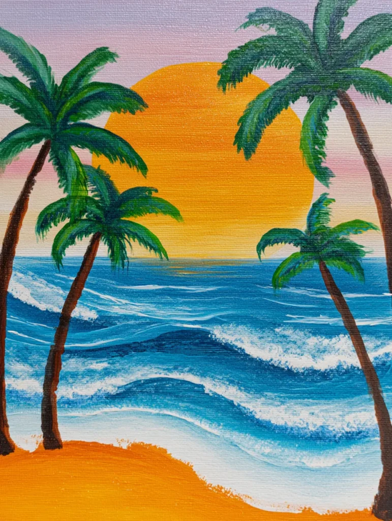 I feel incredibly inspired by the vacation vibes of this beautiful coastal scene. It is a fantastic project to try because you can practice making those wispy palm leaves and textured wave crests without any stress. If you want a painting that feels like a mini getaway, this is the perfect way to spend a quiet evening with your favorite playlist.