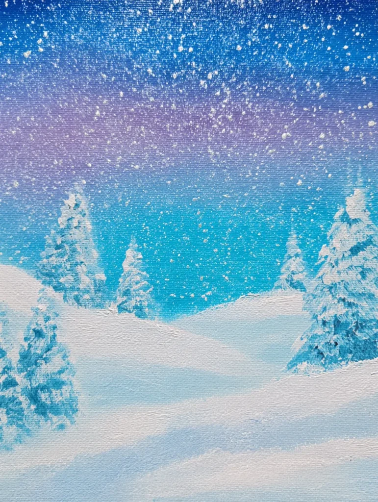 This serene design captures a quiet winter moment with layers of soft white snowbanks under a sparkling icy sky. The color palette is dominated by cool shades of cerulean, sapphire, and pale lavender with pops of crisp white for the snowy drifts. Thick textured brush strokes bring the evergreen trees to life while a dusting of fine white splatters across the upper half of the canvas mimics a fresh snowfall. The composition is elegantly simple using diagonal lines of the hills to create a sense of depth and stillness that feels incredibly fresh and clean.