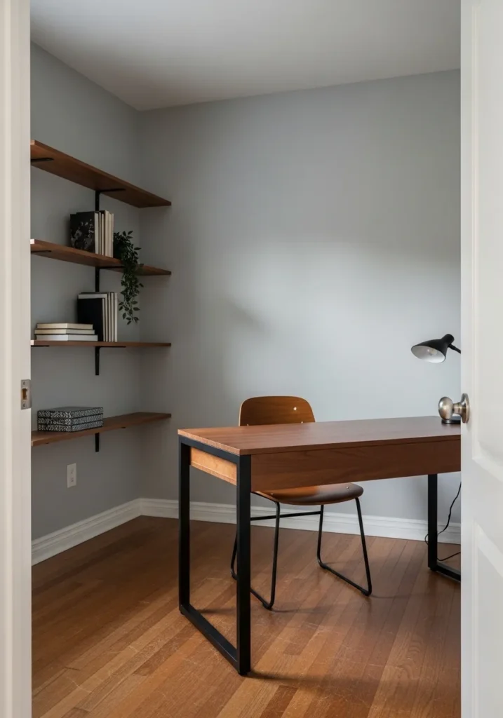 This office pairs a timeless soft gray wall color with warm wooden flooring and a simple modern desk setup. The space feels airy and uncluttered, with floating wood shelves adding both storage and style without overwhelming the room. A sleek black desk lamp and a caramel toned chair bring subtle contrast against the light walls. The natural light bouncing off the gray paint gives the entire room a calm and polished look that works beautifully for everyday productivity.