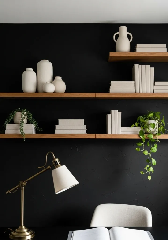 This office features an inky black wall that serves as a dramatic backdrop for warm wooden floating shelves. The contrast between dark paint and natural wood adds striking visual interest. Decorative ceramics and stacked books pop beautifully against the black surface. A brass desk lamp introduces a touch of shine that keeps the space feeling layered and dynamic.