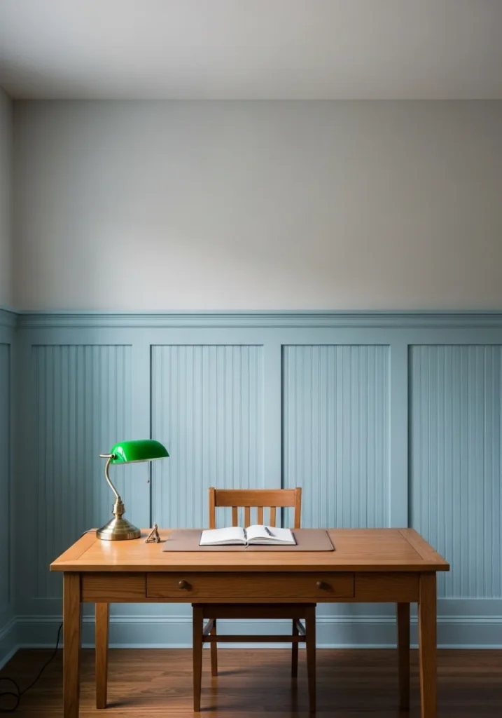 This office combines a soft white upper wall with a muted blue wainscoting below, creating a refined two tone look. The painted paneling adds texture and architectural detail, while the lighter top half keeps the space feeling open. A simple wooden desk and green desk lamp add warmth and contrast against the cool blue. The overall design feels balanced and thoughtfully layered.