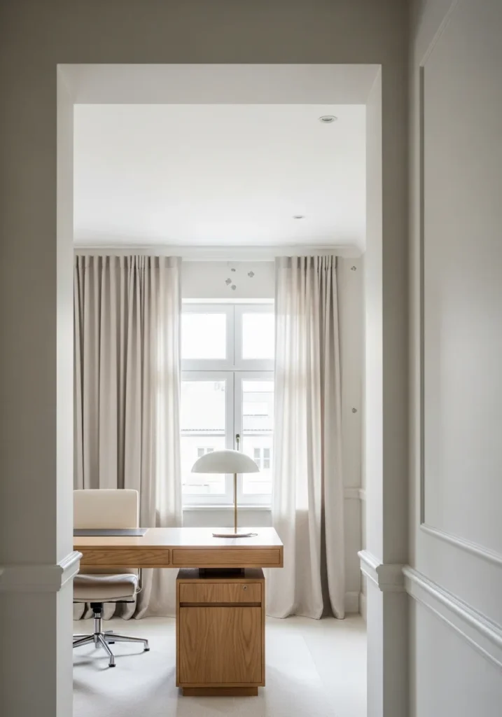 This office embraces a creamy white paint color that instantly brightens the space. The soft neutral walls reflect light from the large window, creating an open and serene atmosphere. Subtle wall paneling adds depth and texture without overpowering the room. A simple wooden desk and light toned furniture keep the look cohesive and elegant. The flowing curtains frame the space beautifully and soften the clean lines.