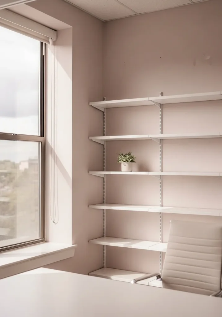 This office features a delicate blush beige paint color that brings warmth without feeling overly pink. The walls glow softly in natural light, creating a cozy and welcoming workspace. Built in open shelving painted in the same tone gives the room a cohesive and custom look. The soft neutral palette pairs beautifully with light wood and subtle decor accents.