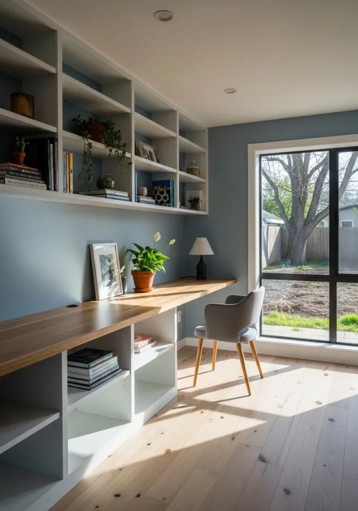 This office features a soft blue gray paint color that feels fresh and balanced. The built in cabinets and drawers are painted to match, creating a seamless and tailored look. Open shelving adds visual interest while keeping the design light and practical. Sunlight streaming through the window enhances the gentle undertones in the paint and keeps the space feeling bright.