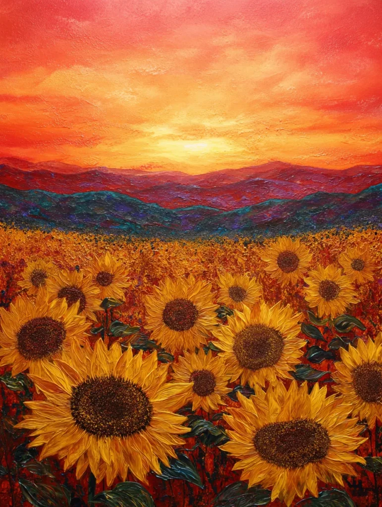 This breathtaking composition features a vast field of sunflowers that seem to glow with their own internal light against a fiery backdrop. The artist used thick impasto techniques to create textured petals that practically jump off the canvas in the foreground. Above the golden blooms, rolling mountain ridges in deep teal and burgundy provide a cool contrast to the warm sky. The layout is dominated by a radiant orange and yellow sky that transitions into soft peach tones at the very top.