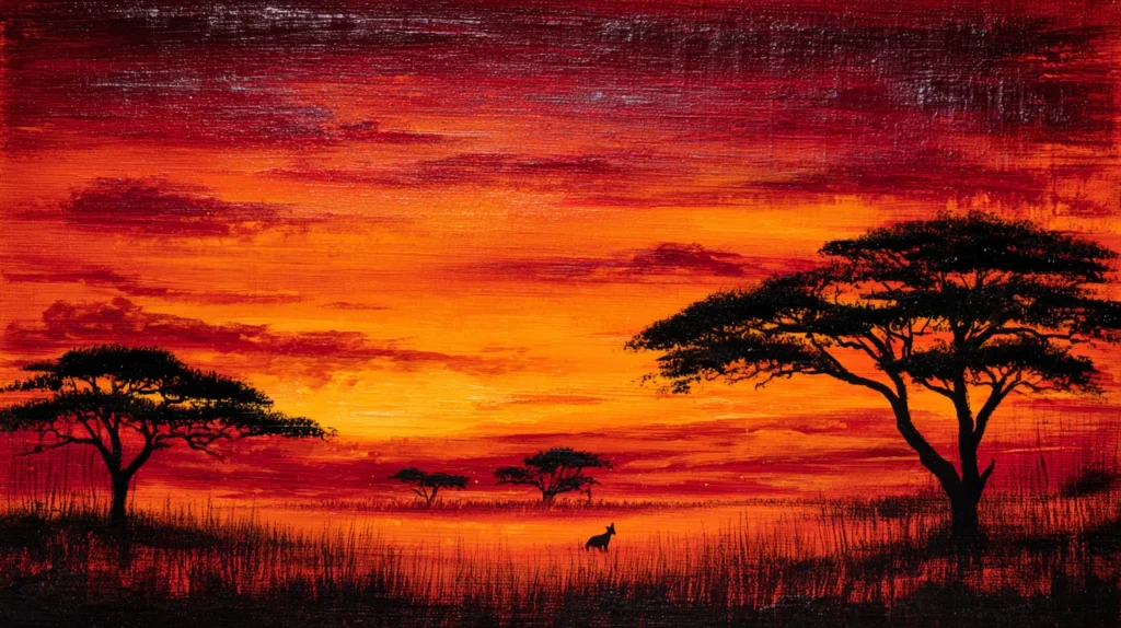 This design pulls you right into a heated African landscape filled with rich crimson and sun-drenched orange tones. The artist used thick palette knife applications to create a wonderful tactile quality in the sky and the golden tall grass at the base. Tall acacia trees with dark leafy canopies frame the center sun, while a tiny giraffe silhouette adds a delightful touch of life to the middle ground. The composition is layered beautifully with distant plateaus fading into the hazy red horizon.