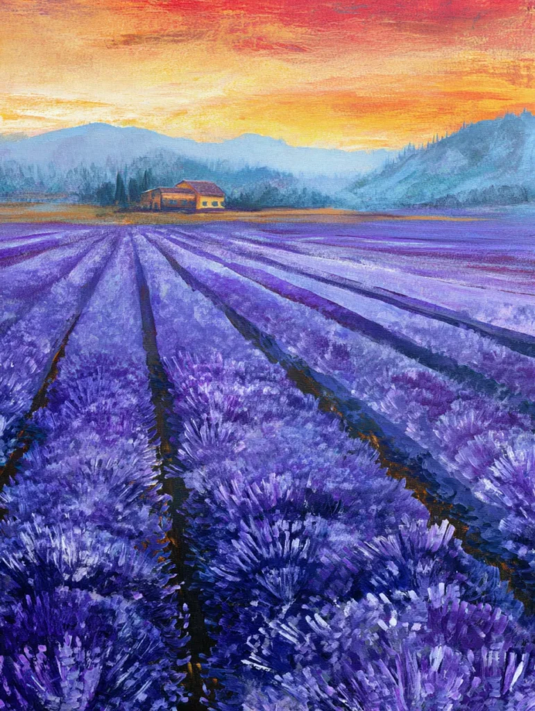 This enchanting scene features perfectly manicured rows of purple lavender stretching toward a cozy golden cottage nestled at the base of blue misty hills. The artist used short and rhythmic dabs of paint to give the lavender plants a fuzzy and realistic texture that leads the eye deep into the landscape. Above the tranquil farm, a warm orange sky blends into soft yellow and peach tones with a hint of red at the very top. The composition uses a strong linear perspective that makes the field feel expansive and incredibly peaceful.