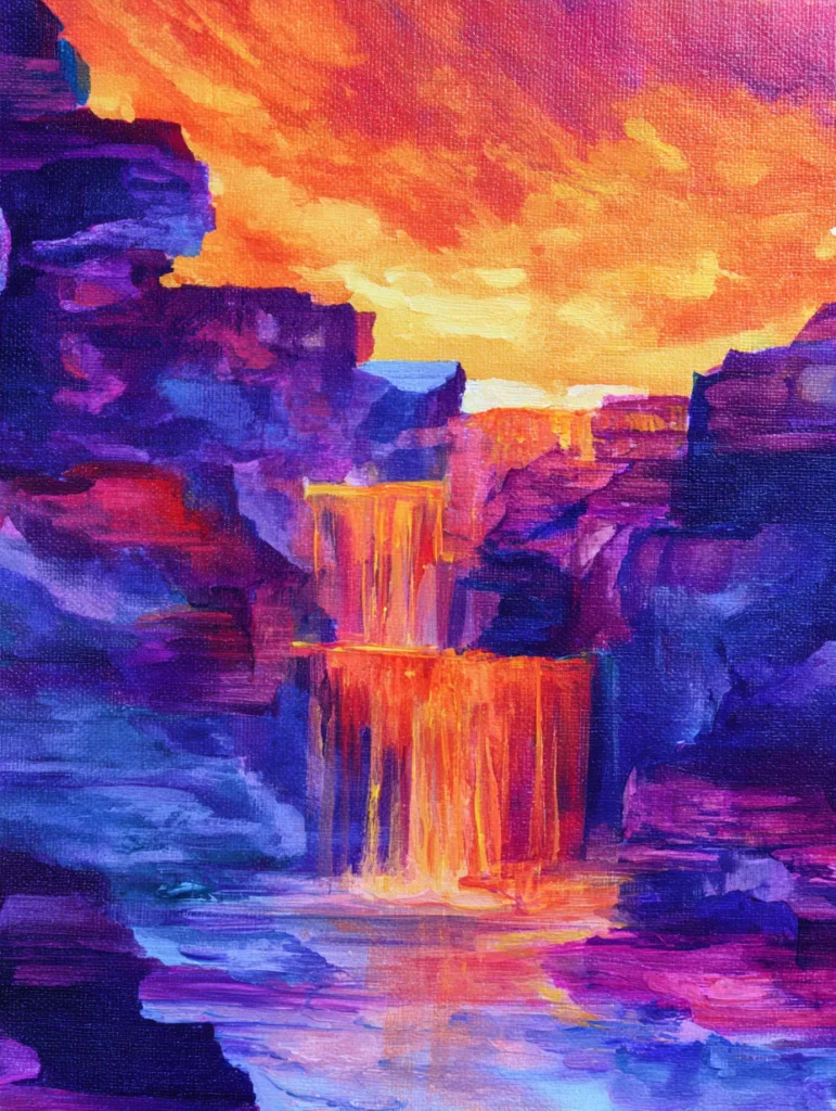 This mesmerizing design features a multi-tiered waterfall pouring through deep violet and indigo rock formations. The water itself glows with intense shades of fire orange and bright yellow, which creates a powerful contrast against the cool shadows of the canyon. Broad and expressive brush strokes give the surrounding stone a rugged feel while the sky above swirls with peach and magenta clouds. The vertical composition draws the eye straight down the center of the glowing falls into a shimmering pool at the base.