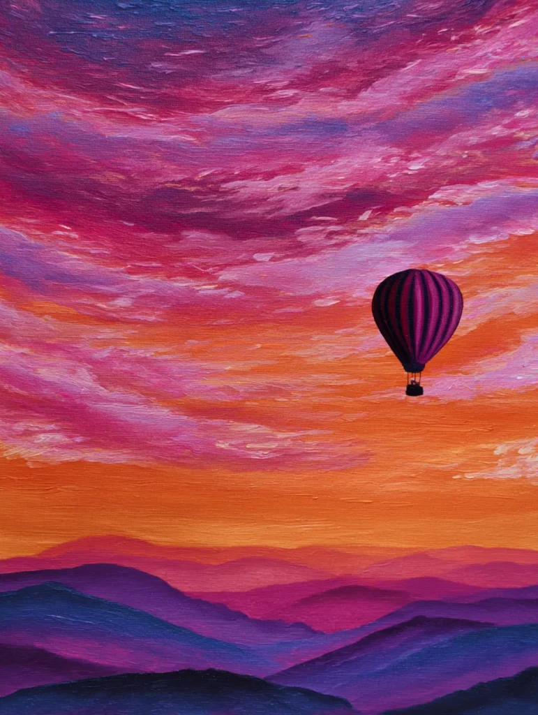I like the whimsical energy of this piece because it feels like a literal escape into a fairytale world. Recreating those soft clouds is such a playful way to practice your blending skills without needing any harsh lines or complex shapes. It is a fantastic project to try if you want to feel a sense of freedom and lightness as you watch your balloon soar over those moody purple hills. You will find that the simple color palette makes it incredibly relaxing to finish in just one cozy afternoon.