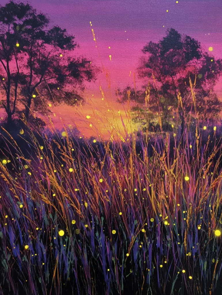 This stunning piece features a vibrant backdrop of deep magenta and soft lavender skies that blend into a golden glow at the horizon. The dark silhouettes of tall trees frame the scene while wild grasses in the foreground are brought to life with energetic vertical brush strokes. Splashes of bright yellow dots represent fireflies scattered throughout the field and sky, which adds a sense of movement and magic. The layering of dark purples against the warm orange light creates a beautiful depth that pulls you right into this twilight moment.