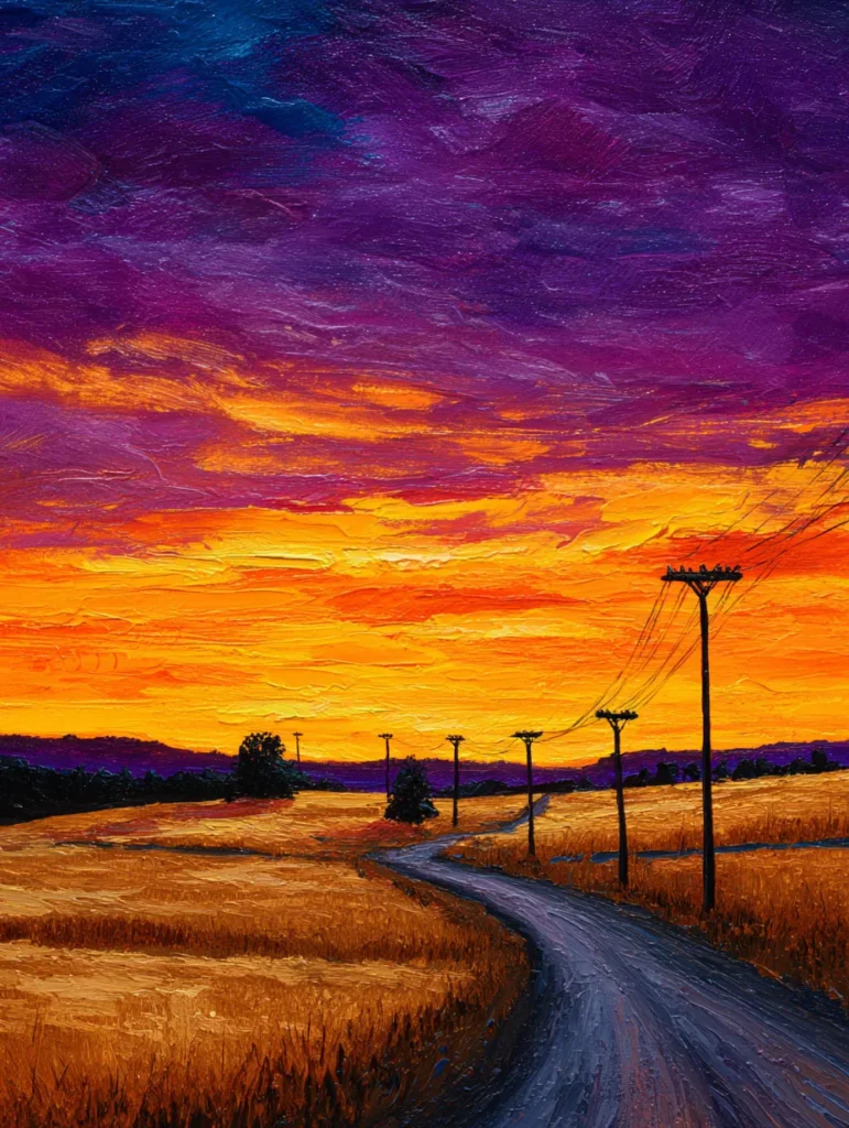 This enchanting landscape features a winding road that leads the eye toward a horizon bursting with brilliant yellow and orange light. Above the sunset, the sky transitions into thick, textured layers of royal purple and indigo, creating a heavy contrast that feels both dramatic and cozy. The fields on either side of the path are rendered with warm ochre and gold horizontal strokes, suggesting the dry, rustling grass of late summer. Telegraph poles stand as dark silhouettes against the radiant background, their delicate wires adding a touch of realistic detail to the otherwise painterly, expressive scene.