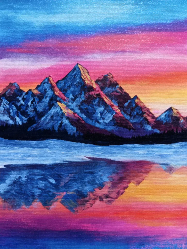 My heart literally skips a beat seeing how those icy blue mountains contrast against the warm cotton candy sky. It is such an engaging project because you get to play with symmetry and reflections, which is way more relaxing than it sounds. You can really experiment with using a dry brush to create those jagged, snowy textures and then switch to a smooth, wet blend for the serene water. For anyone craving a little winter getaway from the comfort of their easel, this design is a total winner.