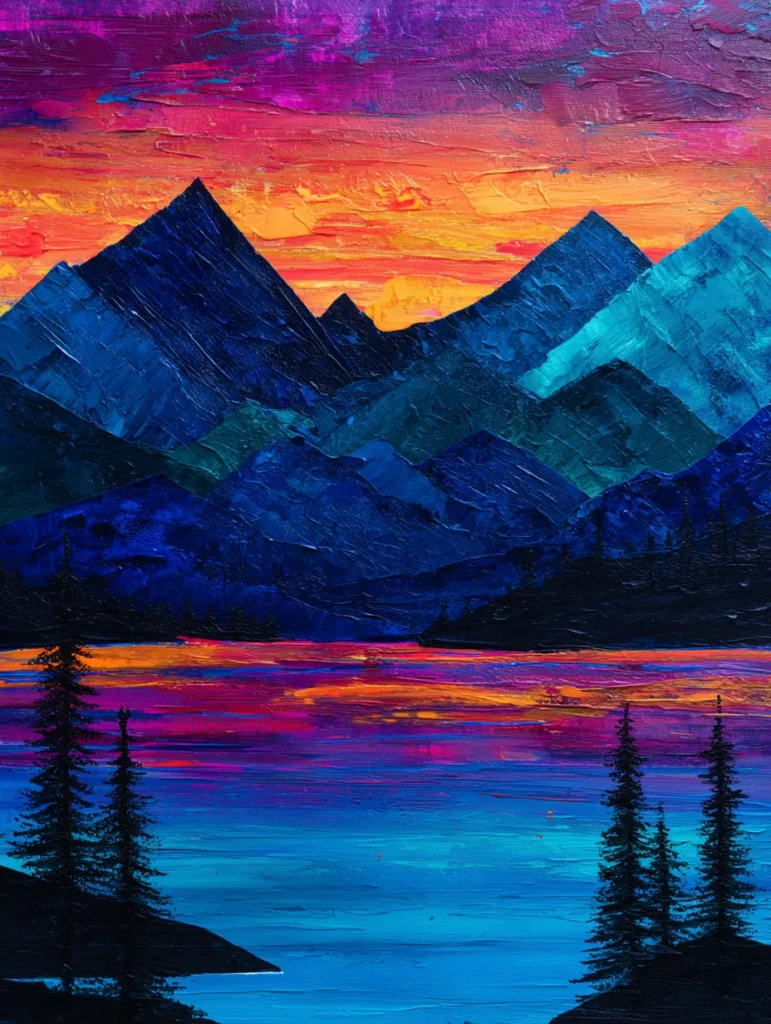 This stunning landscape features a jagged mountain range painted in deep indigo and teal shades that stand out against a neon sunset. The sky is a dramatic blend of violet and blazing orange with thick impasto strokes that give the clouds a heavy and touchable feel. Down below, the cool blue lake perfectly mirrors those fiery sky tones, while dark pine tree silhouettes frame the bottom corners. The vertical layout guides your eyes from the bright peaks down to the shimmering water, creating a sense of immense scale.