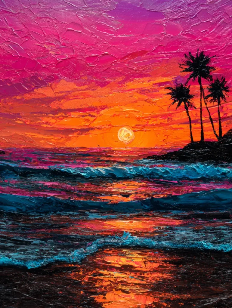 This vibrant coastal design showcases a brilliant yellow sun hanging low over a churning turquoise ocean. The sky is a masterpiece of texture with thick swirls of hot pink and neon orange paint that look like they are popping right off the canvas. On the right side a dark rocky outcrop holds three slender palm tree silhouettes that lean into the scene. The foreground features dramatic crashing waves with white foam highlights created by heavy paint application, while the wet sand below perfectly reflects the fiery colors of the sunset.
