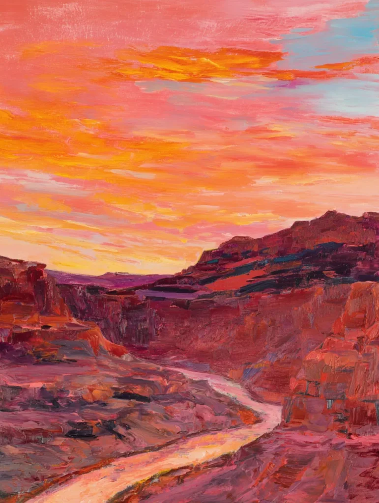 This breathtaking vertical scene features a winding river cutting through deep red and magenta canyon walls. The artist used energetic and choppy palette knife strokes to build up the rocky texture of the cliffs, which contrasts beautifully with the smoother wispy clouds above. A peach and soft orange sky dominates the upper half, while the water reflects a brilliant creamy yellow light that leads the viewer into the distance. The composition feels grand and immersive with the high canyon walls framing the glowing water path.