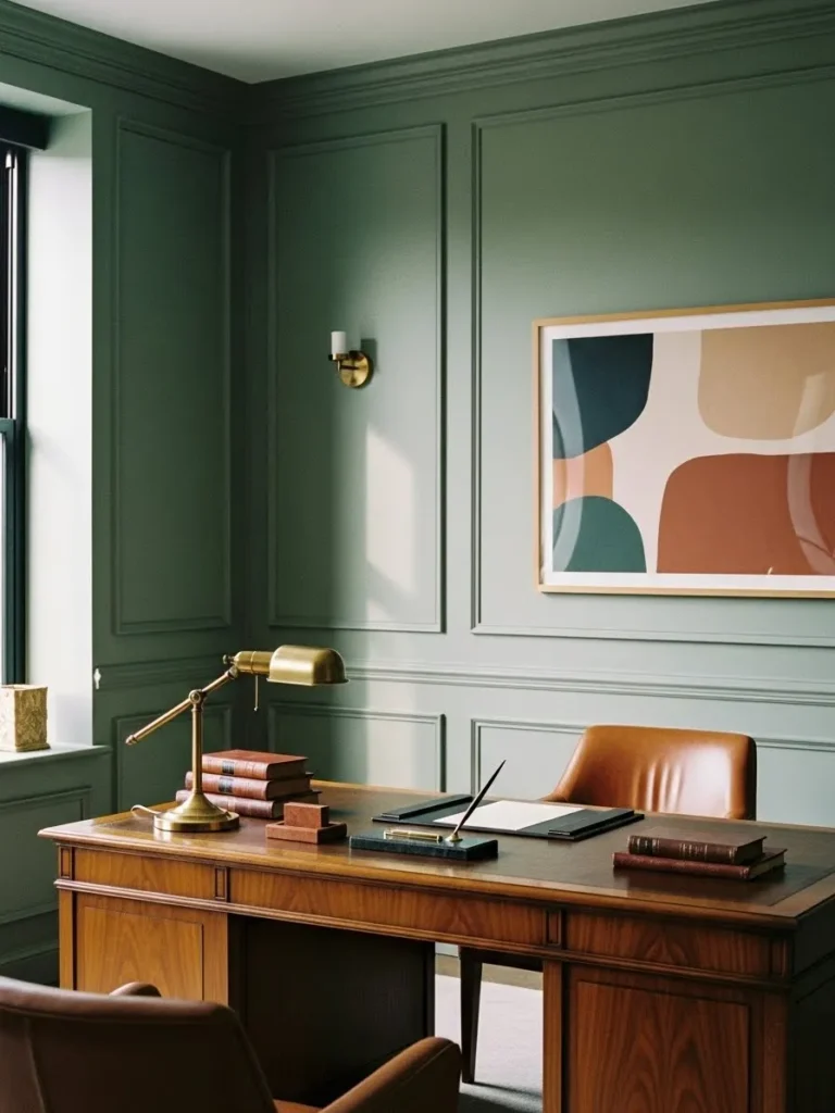 A rich wood desk grounds the space and brings in warmth, paired beautifully with the muted green tones.