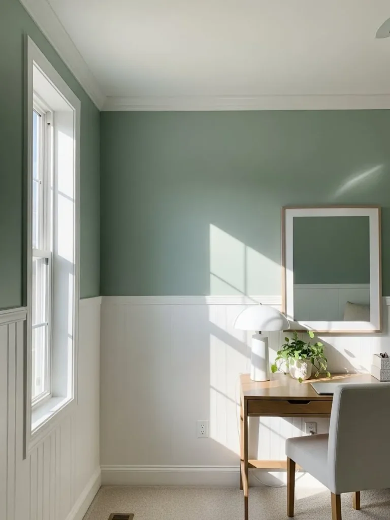 This home office keeps things beautifully simple with soft sage green walls styled in classic paneling that instantly feels calm and collected. Natural light pours in from the side window, creating gentle shadows across the warm wood desk and highlighting the subtle depth of the paint color. The furniture choices are clean and timeless, with a solid wooden desk, a cozy upholstered chair, and just a few thoughtful accessories like a vintage inspired desk lamp, a ceramic mug, and a leafy plant for a fresh touch. Everything feels intentional but not overstyled, which makes the space feel peaceful and easy to work in.
