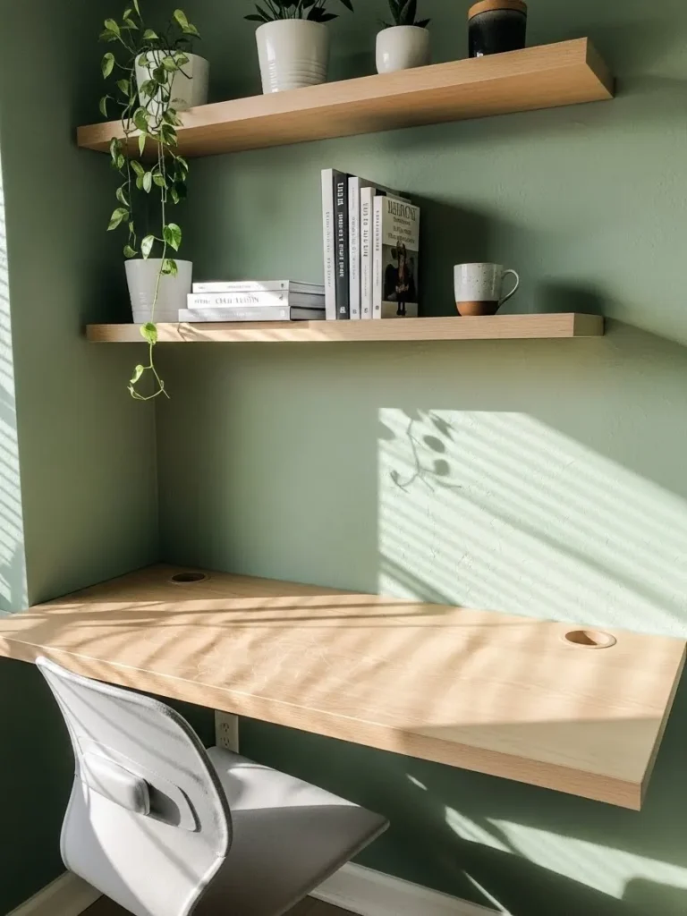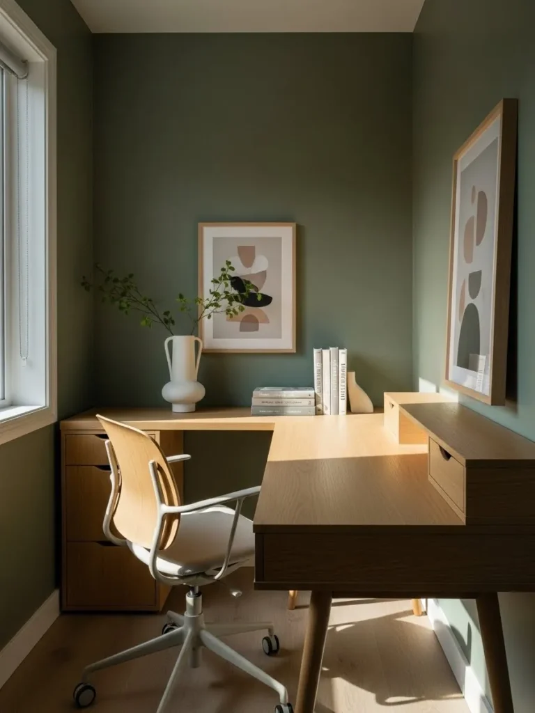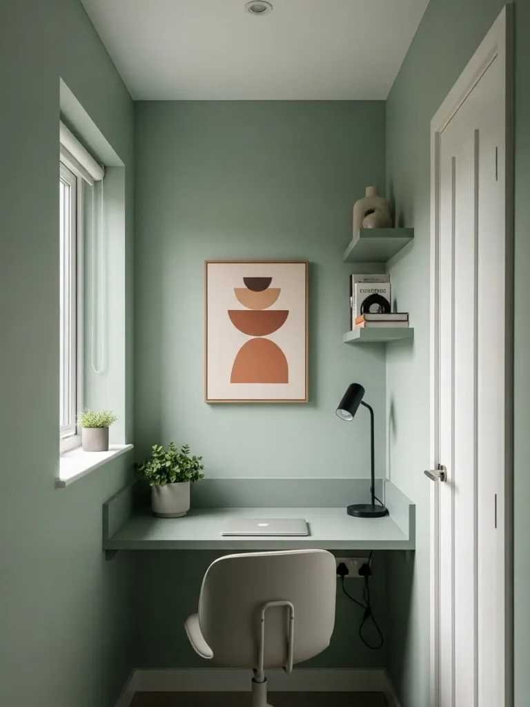 I honestly love how peaceful this setup feels for such a compact spot. It proves that you do not need a huge room to create a workspace that feels stylish and relaxing. I can totally picture myself sitting here with a coffee and a laptop getting things done without distractions. The sage green makes the whole nook feel grounded and gentle which is exactly what I want in a home office that needs to feel both productive and calm.