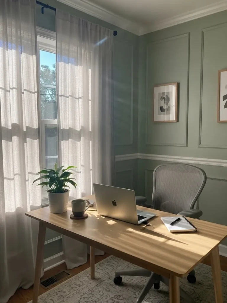 This home office pairs soothing sage green walls with classic panel molding that instantly makes the space feel calm and pulled together. The soft green has a muted, slightly gray undertone that plays beautifully with the warm wood desk and light flooring. Sheer white curtains filter in natural sunlight, keeping the room bright without feeling harsh, while simple framed artwork and a cozy area rug add just enough personality without visual clutter. The overall look feels clean, airy, and quietly elegant, perfect for focused workdays that still feel relaxed.
