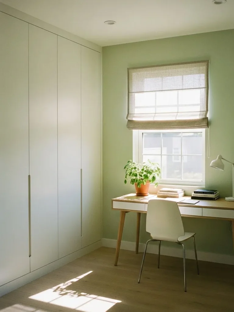 This home office keeps things calm and uncluttered with soft sage green walls that instantly set a peaceful mood. The clean white desk and chair create a fresh contrast that feels light and airy instead of stark. Simple decor like a small potted plant and a sleek desk lamp adds just enough personality without crowding the space. Natural light bouncing off the walls makes the color feel gentle and soothing rather than flat which is perfect for a focused work setup that still feels welcoming.