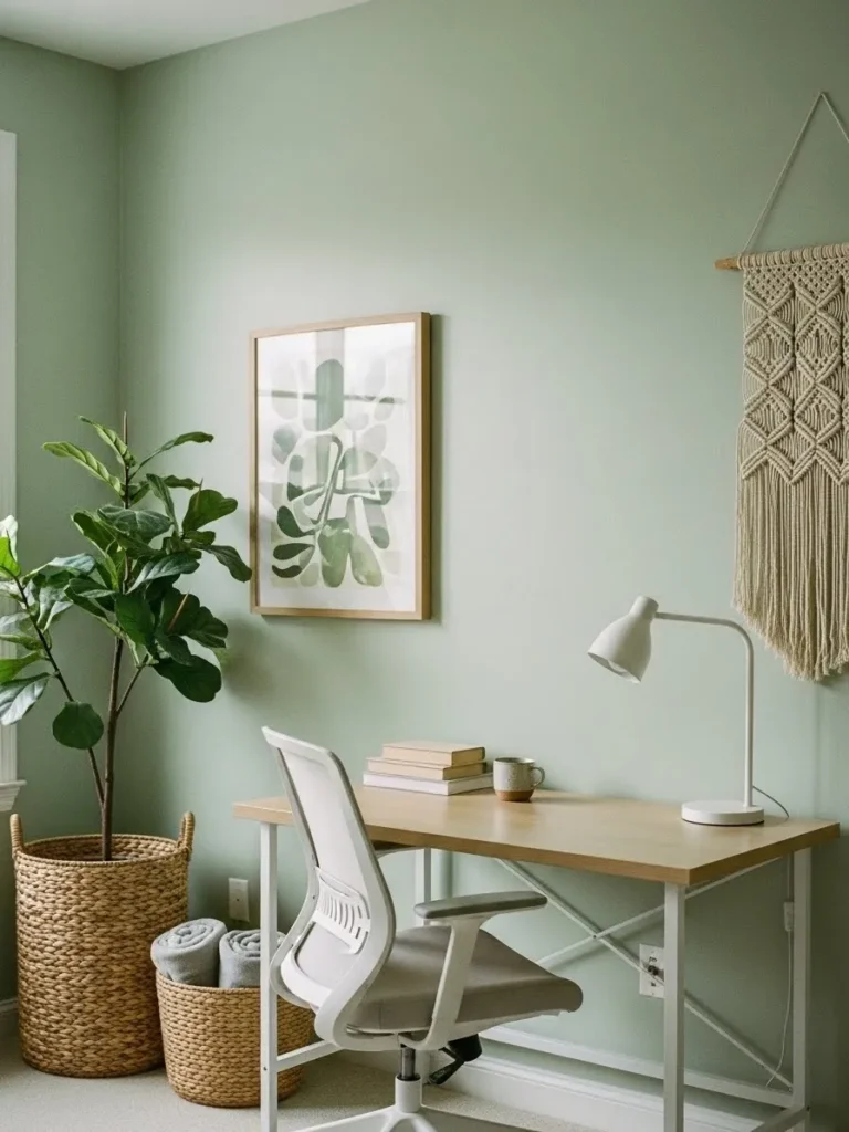 This sage green home office feels calm and quietly put together in the best way. The walls are painted in a soft muted sage that instantly relaxes the space without feeling flat or cold. Light wood furniture keeps everything airy and simple while the white desk chair adds a clean modern touch. Natural textures show up in the woven baskets, the macrame wall hanging, and the leafy plant tucked into the corner, which gives the room that cozy lived in feel. The overall look is minimal but warm, with just enough decor to feel styled without looking busy.